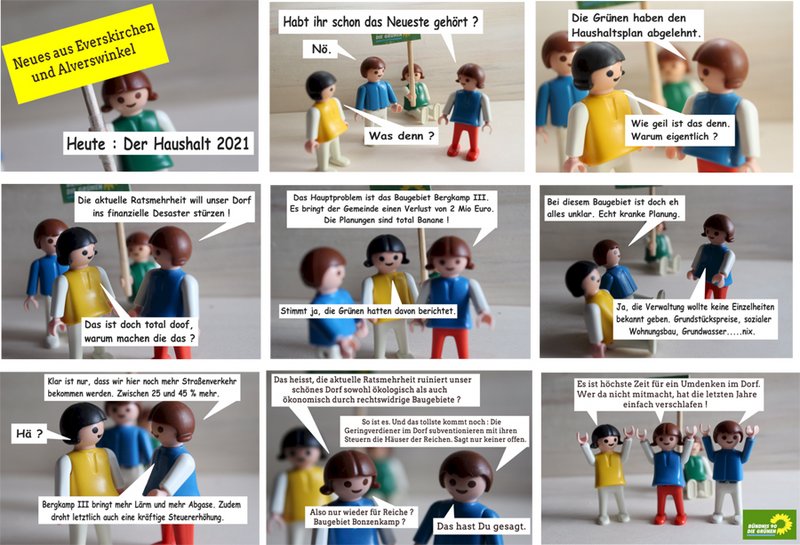 06.12.2020 Das Baugebiet Bergkamp III stand wieder auf der Tagesordnung. Überstürzt musste ein Satzungsbeschluss her. Dass hier wertvolle landwirtschaftliche Fläche für alle Zeiten vernichtet werden soll, ist für uns Grüne Everswinkel nur ein Thema von vielen. Der Teufel steckt im Detail : Die Gemeindeverwaltung kann weiterhin keine konkreten Zahlen auf den Tisch legen. Eine Kostenkalkulation für das Baugebiet liegt zu diesem Zeitpunkt noch nicht vor. Dies wäre aber dringend nötig um einen Beschluss zu fassen. Als verantwortungsvolle Kommunalpolitiker blieb uns keine andere Möglichkeit: Wir mussten das Baugebiet im jetzigen Stadium ablehnen, da wir Grüne die Kommunalhaushaltsverordnung des Landes NRW kennen und das Wohl der gesamten Gemeinde im Blick haben. Nicht dass wir falsch verstanden werden: Wir sehen sehr wohl den Bedarf neuen Wohnraum zu schaffen (dies wurde auch in der Sitzung deutlich von uns gesagt), dafür braucht es aber Transparenz und vor allem Maß und Mitte. Und genau dies liegt nicht vor. Es geht dabei um Millionenbeträge. (für den interessierten Bürger ist das alles im Haushaltsplan 2021 nachzulesen). Unsere Ausführungen im Planungsausschuss am 3.12. konnte die Verwaltung nicht verneinen !